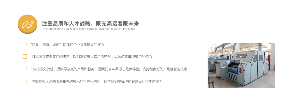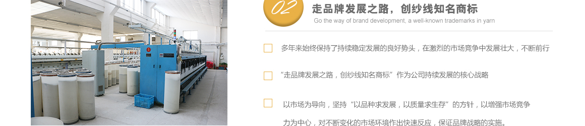 太倉市高陽工貿(mào)有限公司是專業(yè)從事特種紗生產(chǎn)十?dāng)?shù)年的一線生產(chǎn)廠家,坐落于江蘇省蘇州市太倉市雙鳳鎮(zhèn)新湖建湖路29號,太倉隸屬長江三角洲經(jīng)濟圈,交通便捷,經(jīng)濟發(fā)達(dá),是著名的紡織生產(chǎn)基地。 公司歷史要追溯到1982年就成立的新湖毛紡織廠。1996年,毛紡織廠與上海二十二棉在新湖聯(lián)合組建了太倉市新湖福利綜合廠。2002年為適應(yīng)市場的飛速變化,公司轉(zhuǎn)制重組更名為太倉市高陽工貿(mào)有限公司。同時公司適時調(diào)整生產(chǎn)經(jīng)營策略,調(diào)整產(chǎn)品品種結(jié)構(gòu),把生產(chǎn)特種紗作為主要發(fā)展方向,純棉、滌綸竹節(jié)紗是我們的主要產(chǎn)品。 公司多年來始終保持了持續(xù)穩(wěn)定發(fā)展的良好勢頭,在激烈的市場競爭中發(fā)展壯大,不斷前行。我們把“走品牌發(fā)展之路,創(chuàng)紗線知名商標(biāo)”作為公司持續(xù)發(fā)展的核心戰(zhàn)略。以市場為導(dǎo)向,堅持“以品種求發(fā)展,以質(zhì)量求生存”的方針,以增強市場競爭力為中心,對不斷變化的市場環(huán)境作出快速反應(yīng),品牌戰(zhàn)略的實施。公司注重專業(yè)人才的引進和先進技術(shù)的生產(chǎn)化應(yīng)用,具備較強的研發(fā)設(shè)計和生產(chǎn)能力。 公司一直把“品質(zhì)、創(chuàng)新、誠信”作為企業(yè)文化建設(shè)的核心。以品質(zhì)來獲得客戶的滿意,以創(chuàng)新來贏得客戶的贊賞,以誠信來博得客戶的信心。我們把“準(zhǔn)時的交貨期,提供零缺點的產(chǎn)品和服務(wù)”作為奮斗目標(biāo),贏得了客戶的支持和良好的市場信譽。 高陽工貿(mào)有限公司愿與廣大客戶加強合作,共享信息,迎接挑戰(zhàn),共同發(fā)展。客戶需求。了解詳細(xì)>>